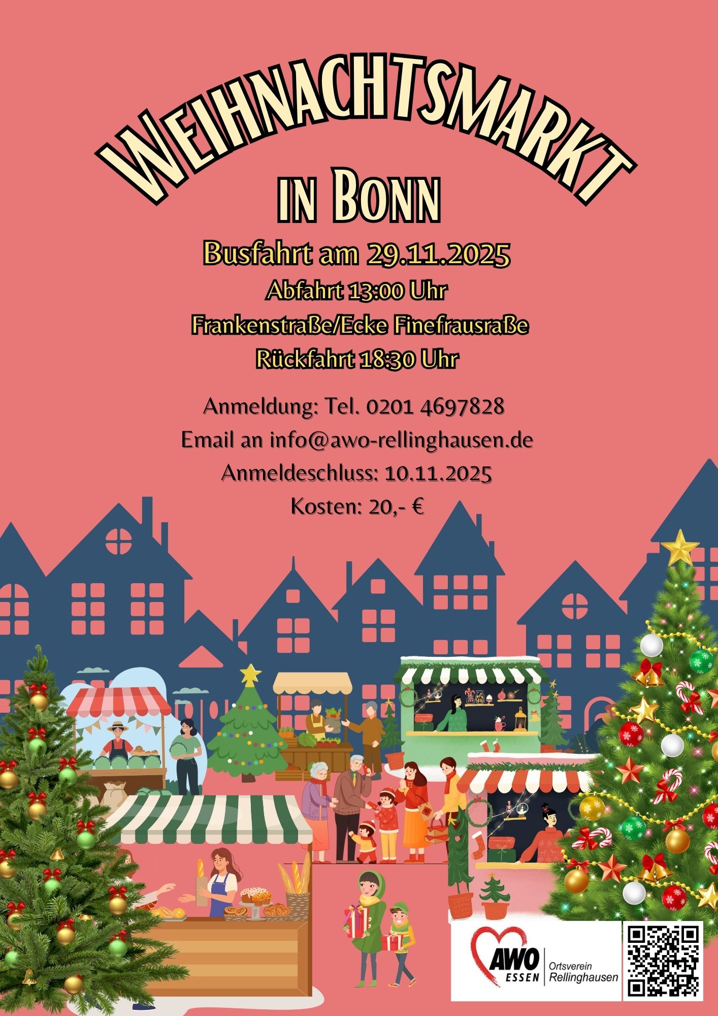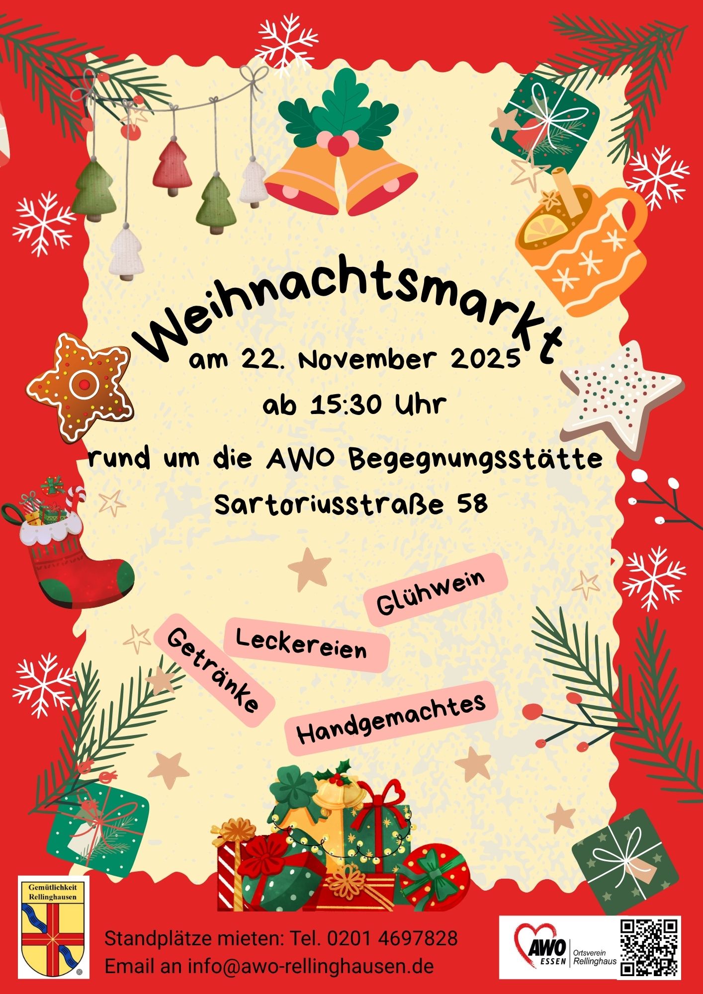 Fast schon Tradition! Es ist wieder soweit! Wir laden euch herzlich ein zum kleinen Weihnachtsmarkt der AWO-Rellinghausen rund um die Begegnungsstätte Sartoriusstraße 58. Kreative, handgemachte Geschenkideen, mit Liebe gemachte Leckereien erwarten euch. Kommt vorbei zum Stöbern und genießt im Garten der AWO Glühwein und andere Getränke und herzhafte Snacks in geselliger Runde. Wie freuen uns auf euch! Es können noch Stände gemietet werden. Auskunft: Tel. 0201 4697828 ...