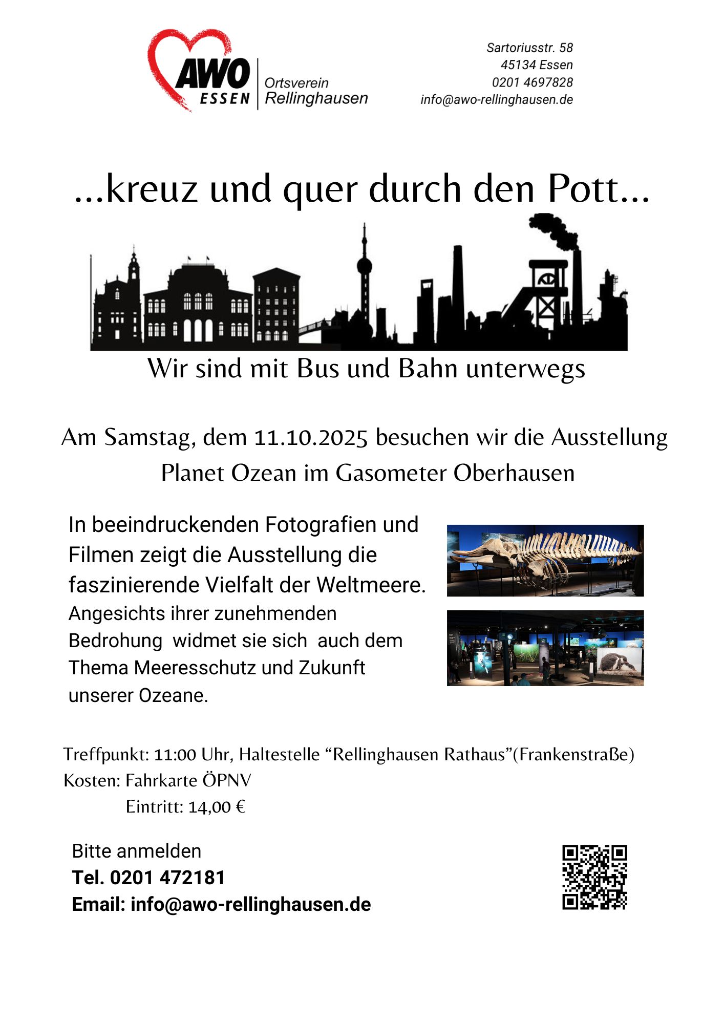...kreuz und quer richtet sich an alle, die gerne mit Menschen unterwegs sind und die vielfachen Ausflugsziele im "Ruhrpott" kennenlernen möchten. Wir sind mit öffentlichen Verkehrsmitteln unterwegs und besichtigen schöne Orte oder Ausstellungen, machen Schiffstouren, besuchen Märkte usw. Kurz: Wir machen uns einen schönen Tag mit netten Menschen. Beim nächsten Ausflug besuchen wir die Ausstellung Planet Ozean im Gasometer Oberhausen. Neue Ausflüge erscheinen auch bei den Downloads.